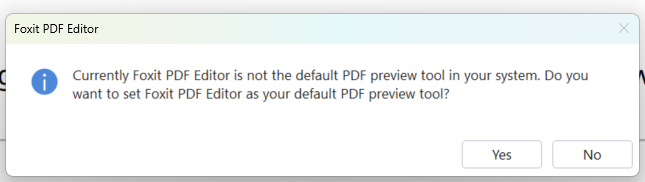 Suppress Foxit PDF default viewer prompt for Reader and Editor.